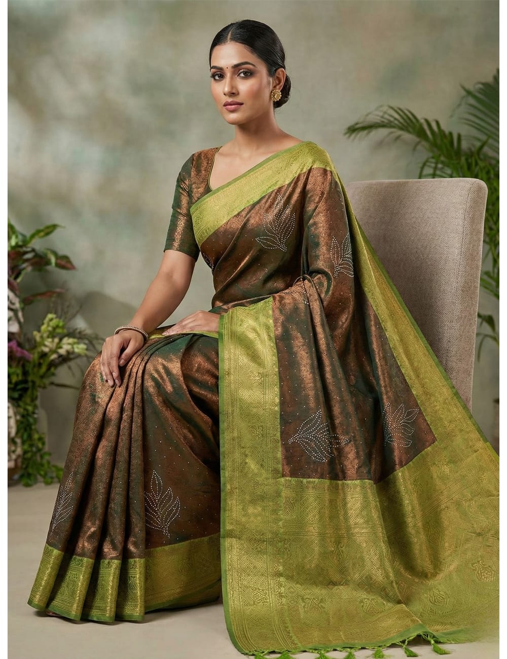 Fabric: Made from 100% Banarasi tissue silk i'ts breathability and comfort. Colour: Bottle green with pink, Blue...