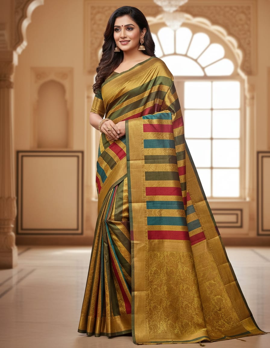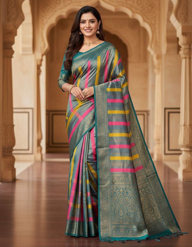 Bring colour and tradition together with our Kanchipuram Multicolour Vertical Lines Saree 💖Designed with elegant vertical...
